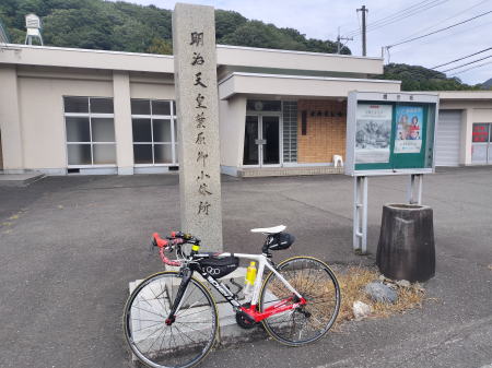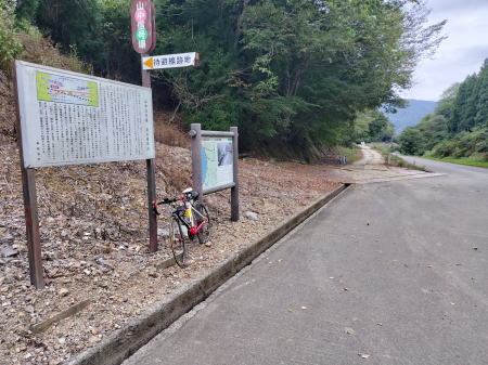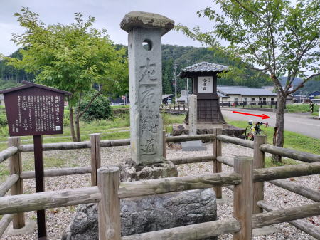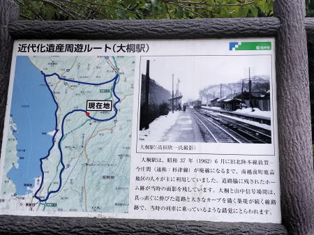「山中隧道」から今庄までは気持ちのいい幅広い道の下り坂。ペダリングもせずに、約4キロをドンドン下って比較的平坦路になると旧大桐駅の上り線ホーム跡に到着。ここには国鉄時代のD51形蒸気機関車の動輪や信号機が展示されている。旧線にあった3つの中間駅のうち、唯一その姿をとどめている。