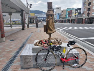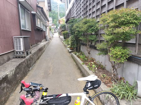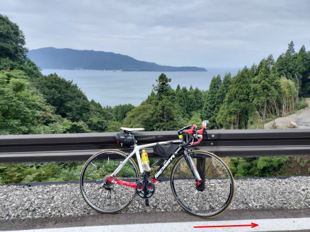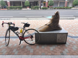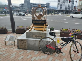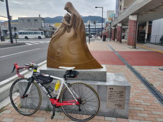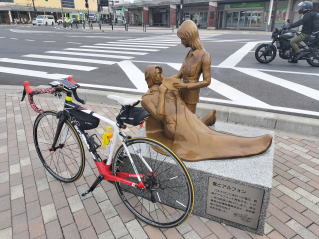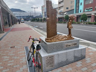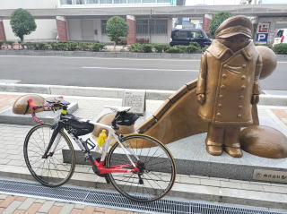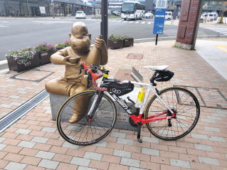 外出して朝食を食べてからホテルに車の駐車をお願いして7時に曇り空の中、出発する。本日は多くのトンネルを通るために前照灯を2つ、尾灯も2つ取り付けて準備完了。国道8号線を横切り、敦賀駅前を通るとアーケードに松本零士の有名な作品である「宇宙戦艦ヤマト」と「銀河鉄道999」にちなんだモニュメントがあちこちに設置されている。敦賀市がかつて重要な鉄道と港の町であったのでそのイメージで、松本零士作品を選んだのが理由らしい。折角なのでので多くの通勤者が見ている中、撮影して😅からトンネル群に向かう。