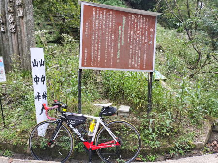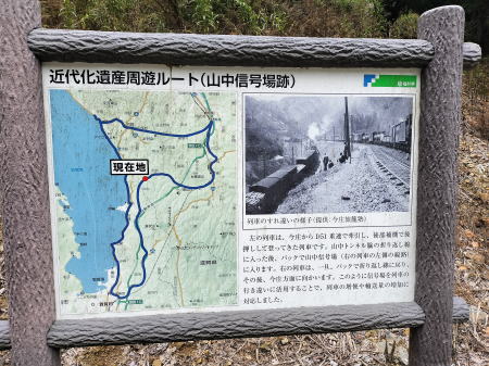 「伊良谷隧道」からわずか90mでトンネル群の中でも最も長い「山中隧道」へ。山中峠を越すトンネル手前には黒田清隆が揮毫した扁額「功加于時」のレプリカと山中隧道殉職者慰霊碑が設置されている。心細いライトの光と天井からシャワーの様に降って来るたくさんの水の中、上り坂のピークとなる9つ目の山中隧道を抜ける。今庄方には「徳垂後裔」のレプリカがある。隧道の東側(右)奥にはスイッチバック用の折り返し線があり、その先にトンネルが見える。トンネルの中は20mほど先で行き止まりとなっている。本線に戻って500m程、進むと山中信号所跡がある。単線線路なのですれ違えるポイント(信号場)を作って、今庄からは1000分の25の急勾配なので、列車を止めようにも止めることができない。そのために先ほどのトンネル折り返し線を作って、本線の車両が通過後、信号所に戻ってから本線に戻ったと説明書きがある。