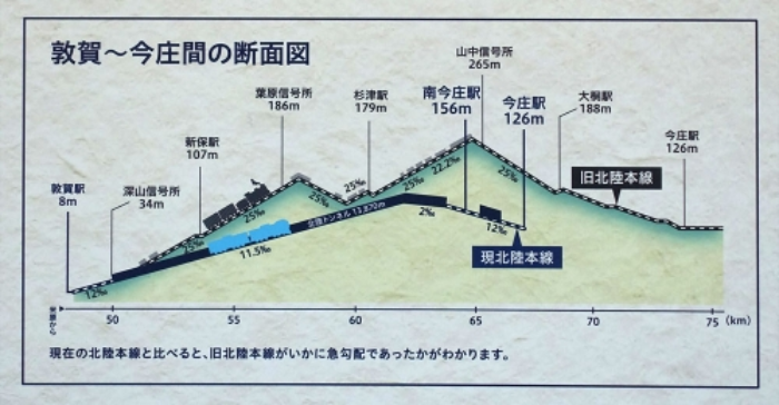 前日(23日(月))に引き続き、本日(24日(水))は旧北陸鉄道トンネル群から今庄宿までのサイクリング。旧国鉄北陸線は明治29年(1896年)に敦賀ー今庄間が開通。鉄道技術の限界と言われる山間部の急こう配を巡る長さ26.4Km。山岳路線の山中峠ルート(明治29年開通)で、4ヶ所のスイッチバックで25‰(パーミル)の急勾配を克服し、3ヶ所の駅、3ヶ所の信号場、11ヶ所のトンネル、1ヶ所のロックシェッドで越前と若狭を隔てる難所を克服している。旧街道が越える標高約630mの木の芽峠を避けて、敦賀湾沿いの山腹を大きく迂回していたがそれでも標高265mまで上る必要があり、前後に急勾配とトンネルが連続する鉄道。旧線路跡は敦賀市街から葉原までが国道476号、葉原から杉津までが敦賀市道、杉津から今庄までが福井県道207号今庄杉津線。