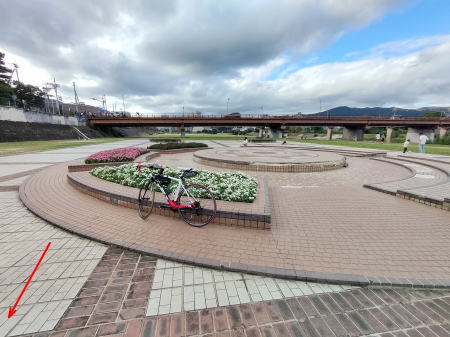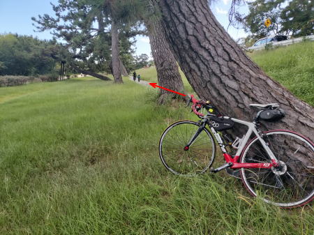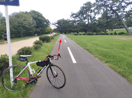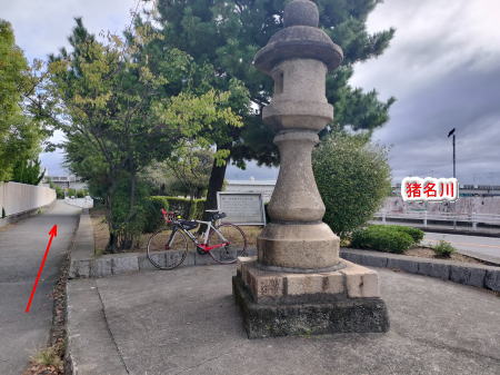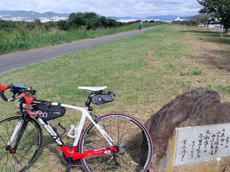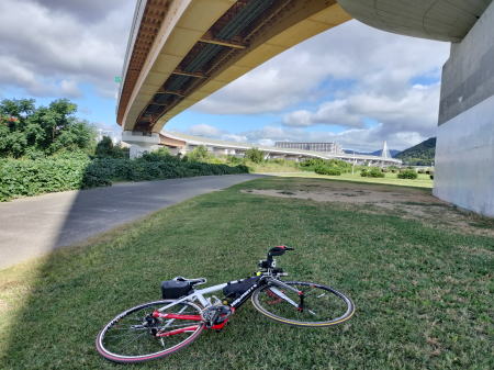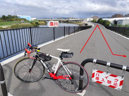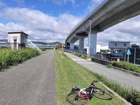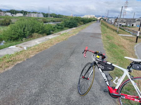 改めて猪名川右岸土手上を走り始めるがすぐに地道になってしまう。この未舗装路の衝撃で問題のサドルバッグがサドルから外れてタイヤに食い込んでしまう。取りあえず応急処置として輪行時にホイールを固定するためのゴムバンドでサドルに固定。これが意外にも効果があり、その後は一度もサドルバッグの脱落は発生しなかった😊。更に土手道は「阪急神戸線」で行く手を阻まれる。どうもこの辺りは自転車用にはあまり整備はされていないようだ。右下を見ると河川敷のコンクリート舗装上をジョギングしている人を見かけるのでそちらに移りたいと思うが下り口が見当たらない。仕方無いのでそのまま地道を走っていく。