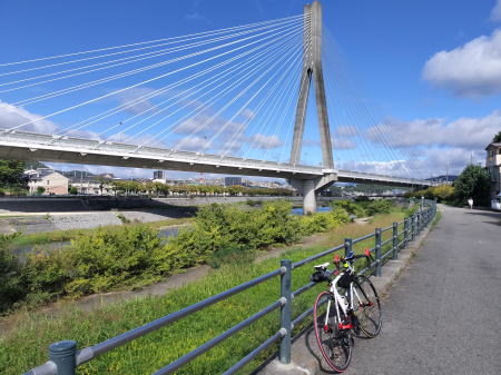 阪神高速11号線に架かる綺麗な斜張橋である新猪名川大橋の下を潜り、国道173号線に合流、交通量が多いので歩道を走っていく。何人かのサイクリストに追い越されながら能勢電鉄鼓滝駅手前で「銀橋」を渡り、県道12号線(猪名川渓谷ライン)に入る。ここから暫し、猪名川から離れる。