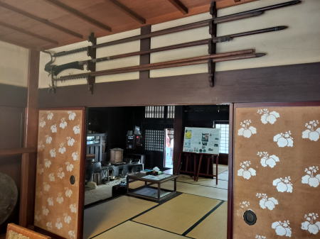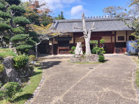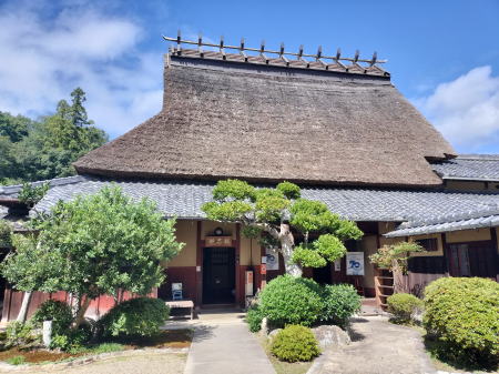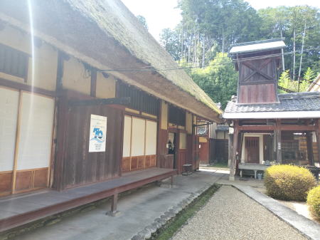 新名神高速道を潜ってから右手に曲がると3つ目の訪問地「い~な!!さくら通り」であるが時間もあまりないので諦め、直進して先を急ぐ。猪名川町内に入ると立派な茅葺の屋根が高台に見える。多分、4つ目の訪問地である「旧冨田家住宅(静思館(せいしかん))」と思い、向かうがその入り口を見付けるのに彷徨う。ようやく猪名川町役場から静思館の裏口に入ることができた。富田熊作が3年の年月をかけて建てた茅葺き屋根に総桧造りの主屋、4つの土蔵、表門など建築面積534.3平方メートルの広壮な屋敷で国登録有形文化財となっている。広い内部も無料で見学できる立派な建物である。