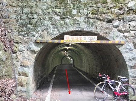 猪名川町スポーツセンターを通り過ぎて左岸に渡り更に上流を目指す。川幅はだんだん狭くなってくる。猪名川町立楊津(ようしん)小学校横を通り過ごすと「この先700mトンネルあり」の注意書きがあるのでそのまま段々きつくなる山中のつづら折りの坂道を登って行く。勾配は10%にもなる。息切れ後、7つ目の訪問地、明治時代に作られた「くろまんぷ(津坂隧道)」に到着。現在、「くろまんぷ」の元となった岩肌は残念ながらコンクリートで内部は固められ、苦労して掘ったであろう岩肌は見ることはできない。しかし出口側(西側)はその面影は残っている。石製トンネルで現在も使用されているものの中で、日本最古とも言われている。