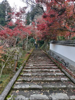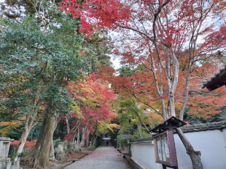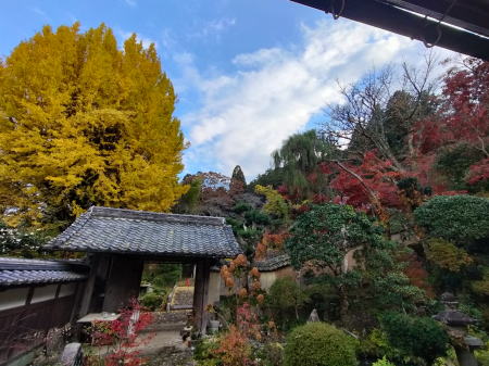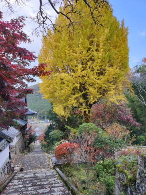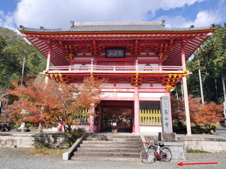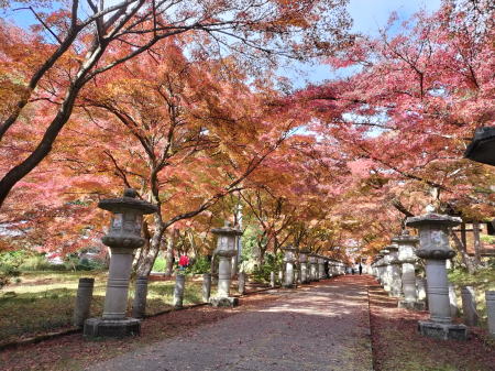 高山寺付近には手軽な食事処見かけなかったのでコンビニにてパンと飲み物を買って昼食。町中を抜けて直ぐに無料の広い駐車場がある「高山寺」に到着。大きな仁王像が安置されている重層の山門前には無人の浄財箱があり、300円を納めて中に入っていく。石灯篭が並んでいる参道両脇を中心に真っ赤に色付いた見事なイロハモミジが境内を彩って紅葉🍁のトンネル状となっている。境内のあちこちにもモミジが紅葉している。素晴らしい光景である。