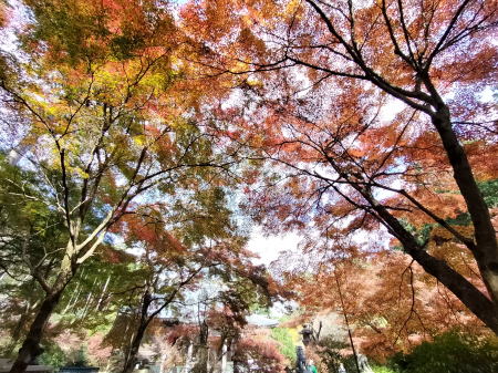 | 高山寺本堂側からの紅葉トンネルと絨毯参道→ | 見上げて→ |