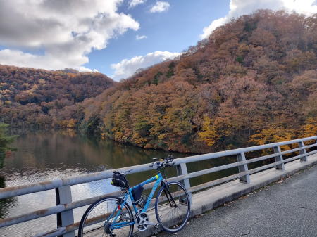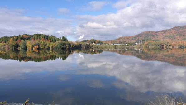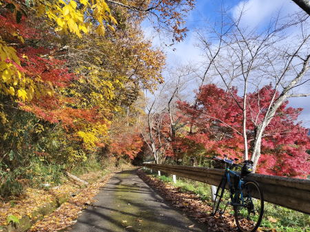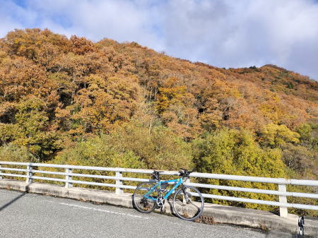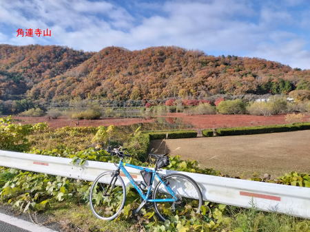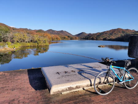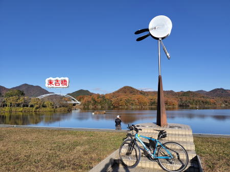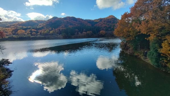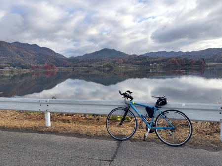 まずは北に向かって車道を走行して「御旅橋(おんたびきょう)」の手前からは湖岸道に入り、真っ赤なモミジ🍁や黄色葉の雑木林で囲まれた紅葉の中を走ることになる。大堰橋(たいがんばし)で折り返して県道38号線を南下していくと今度は右手に朝日に照らされた紅葉した「角連寺山(かくれんじさん)」が湖面に映えて雲と山が湖面に上下逆さまに映っている。暫しの癒しの一時。サイクリングを再開するが県道には車がほとんど通行していないのでゆっくりと風景を楽しみながらである。