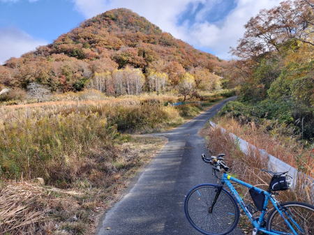 | 黒郷橋を渡る→ | 飯盛山も全山紅葉 眺めながら裾を巻いていく→ |