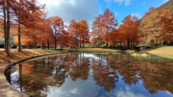 赤く紅葉しているラクウショが連立している「小野公園」に到着すると池の周を囲っているラクウショウが水面に映えている。池の水面が鏡のようになり、真っ赤に染まった紅葉と青い空を上下対称に映し出す「逆さ紅葉」の光景は、素晴らしいの一言。睡蓮の池のような幻想的な風景から「モネの池」と称されている所以である。到着時は丁度、風がなぎていて池面に綺麗に青空とともにラクウショが映えている。しかししばらくすると曇り空となり、束の間の撮影時間である。