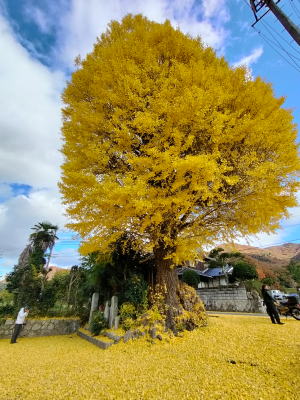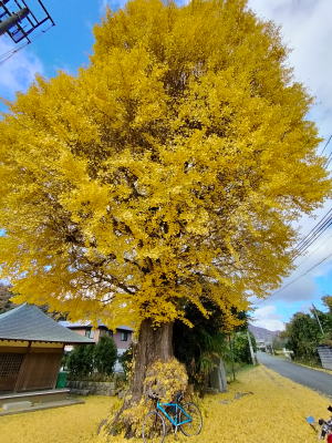 小野公園から700mぐらい離れて北側にある「小野大日堂」の銀杏も立派な大木で網引駅の銀杏(雌木)と違って雄木。従ってギンナンは落ちていないので匂いも無い。足元には一面の黄色い落ち葉🍂絨毯である。ここは道路脇にあるので何人かの単車ライダーも愛車と共に写真を撮っている。